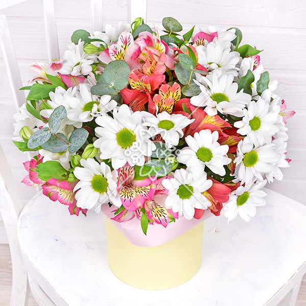 хризантема белая кустовая – 5 шт., альстромерия розовая – 8шт., зелень декоративная (эвкалипт), оазис, коробка.